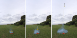 You can launch your rocket from a special launch pad that helps to keep it steady so it doesn't tip over. When you're ready to launch it, you press a button that starts a countdown, just like in the movies. Then you press the button again and the rocket engine ignites, creating a huge whooshing sound as it flies off into the sky.