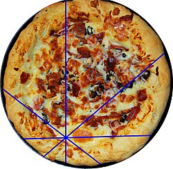 You see, the pizza theorem says that if you take any circle - like a pizza - and draw two perpendicular lines through the center, the parts they divide the circle into will have the same total length. That means if you cut a pizza into any number of slices, as long as the cuts all go through the center, each slice will have the same amount of crust.