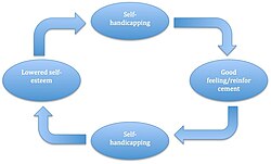 Self-handicapping is when someone puts extra obstacles that get in the way of their own success. For example, if someone wants to do well on a test, they might stay up late studying, but they might also stay up late partying, which would act like a "handicap" to their success. It's like they are intentionally making it harder for themselves to do well. It could be an excuse for why they didn't do as well as they wanted because it's not their fault - it's the handicap's fault.
