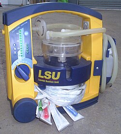 Suction in medicine is when doctors use a machine to remove extra fluids or mucus from parts of your body such as your nose, mouth or lungs. Imagine if you drink a big gulp of water and some of it goes down the wrong tube making you cough, the doctor could use suction to remove that water from your lungs so you can breathe easy again! The machine uses a special tube that goes into your body and sucks up the extra fluid with gentle suction, like a vacuum cleaner. This helps the doctor make sure that you do not get infections, breathing troubles or any other problems. It's like cleaning out your body to make you feel better!