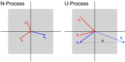 But wait, there's more! Umklapp scattering is a special kind of bumping that happens when atoms in a solid meet each other. When this happens, the atoms cause waves or vibrations in the solid. Imagine you are shaking a rope up and down, and the waves go from one end to the other. When atoms in a solid shake, we call it phonons.